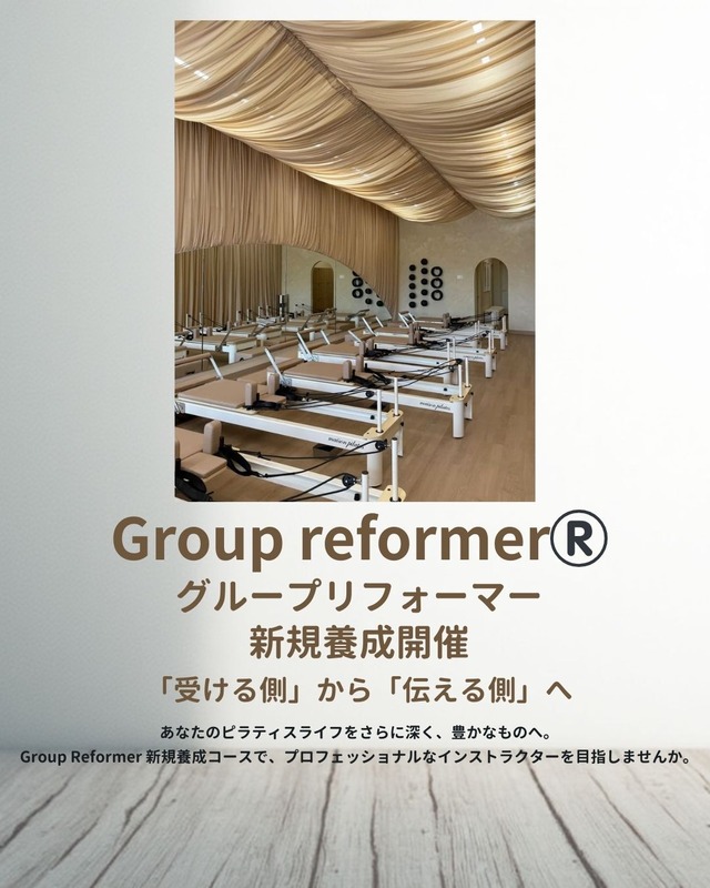 新規養成を実施します。 ピラティス/Group-Reformer®(グループリフォーマー)指導者養成プログラムは、 複数台のリフォーマーを用いたグループ指導を「安全に・効果的に・継続可能な形」で実践できる指導者を育成する養成です。 本養成では、単なるエクササイズ指導ではなく、 ✔ クラス全体を見渡す視点 ✔ 負荷・動きの設計力 ✔ スタジオ運営に直結するグループ構成 を体系的に学びます。 パーソナル指導から次のステージへ進みたい方、 グループマシンピラティスを導入・強化したいスタジオ様に 最適な内容です。 「教える」から「場をデザインする」指導者へ。 これからのピラティス現場に求められるスキルを身につけていきます。 【商品概要】 ピラティス/Group-Reformer®(グループリフォーマー)指導者養成プログラムは、リフォーマーを用いたグループトレーニングを「安全に・効果的に・継続可能な形」で実践するためのヒントが満載です。複数台のリフォーマーを使って、様々なニーズに応えられる指導者を育成します。これにより、参加者が楽しみながらトレーニングを続けられる環境を整えることが可能です。 【製品の特徴】 このプログラムでは、効果的なグループクラスの実施に必要な知識や技術を学ぶことができます。各指導者は、クライアントのレベルに応じてアプローチを変える手法や、グループでの相互作用を促進する方法を習得します。安全面にも配慮しており、効果的な指導を行う力を育てます。今までの経験を活かす機会にぜひご参加ください! 【対象】 初心者から経験者まで、どなたでも参加できます。ピラティスに情熱を持つ方、グループレッスンをより充実させたい方に最適です。仲間と共に学び、技術を向上させることができる貴重なチャンスをお見逃しなく! 【納期について】 ご注文からプログラム開始までは約2ヶ月を目安にご案内いたします。お申込み時期や受講状況によって変動する場合がありますので、予めご了承ください。 【利用時のQ&A】 Q. プログラムはどれくらいの期間ですか? A. 全体で数回に分かれたセッションを予定しており、詳細はお申込後にお知らせいたします。 Q. 特別な経験は必要ですか? A. 特別な経験は不要ですが、基本的なピラティスの知識は有利です。興味のある方は大歓迎です! Q. 質問や不安がある場合はどうすれば良いですか? A.いつでもお気軽に電話又はメールにてご相談ください。しっかりとサポートいたします! 【商品概要】 ピラティス/Group-Reformer®(グループリフォーマー)指導者養成プログラムは、リフォーマーを用いたグループトレーニングを「安全に・効果的に・継続可能な形」で実践するためのヒントが満載です。複数台のリフォーマーを使って、様々なニーズに応えられる指導者を育成します。これにより、参加者が楽しみながらトレーニングを続けられる環境を整えることが可能です。 【製品の特徴】 このプログラムでは、効果的なグループクラスの実施に必要な知識や技術を学ぶことができます。各指導者は、クライアントのレベルに応じてアプローチを変える手法や、グループでの相互作用を促進する方法を習得します。安全面にも配慮しており、効果的な指導を行う力を育てます。今までの経験を活かす機会にぜひご参加ください! 【対象】 初心者から経験者まで、どなたでも参加できます。ピラティスに情熱を持つ方、グループレッスンをより充実させたい方に最適です。仲間と共に学び、技術を向上させることができる貴重なチャンスをお見逃しなく! 【利用時のQ&A】 Q. プログラムはどれくらいの期間ですか? A. 全体で数回に分かれたセッションを予定しており、3ヶ月程度の養成となります。詳細はお申込後にお知らせいたします。 Q. 特別な経験は必要ですか? A. 特別な経験は不要ですが、基本的なピラティスの知識は有利です。興味のある方は大歓迎です! Q. 質問や不安がある場合はどうすれば良いですか? A.いつでもお気軽にご相談ください。しっかりとサポートいたします!